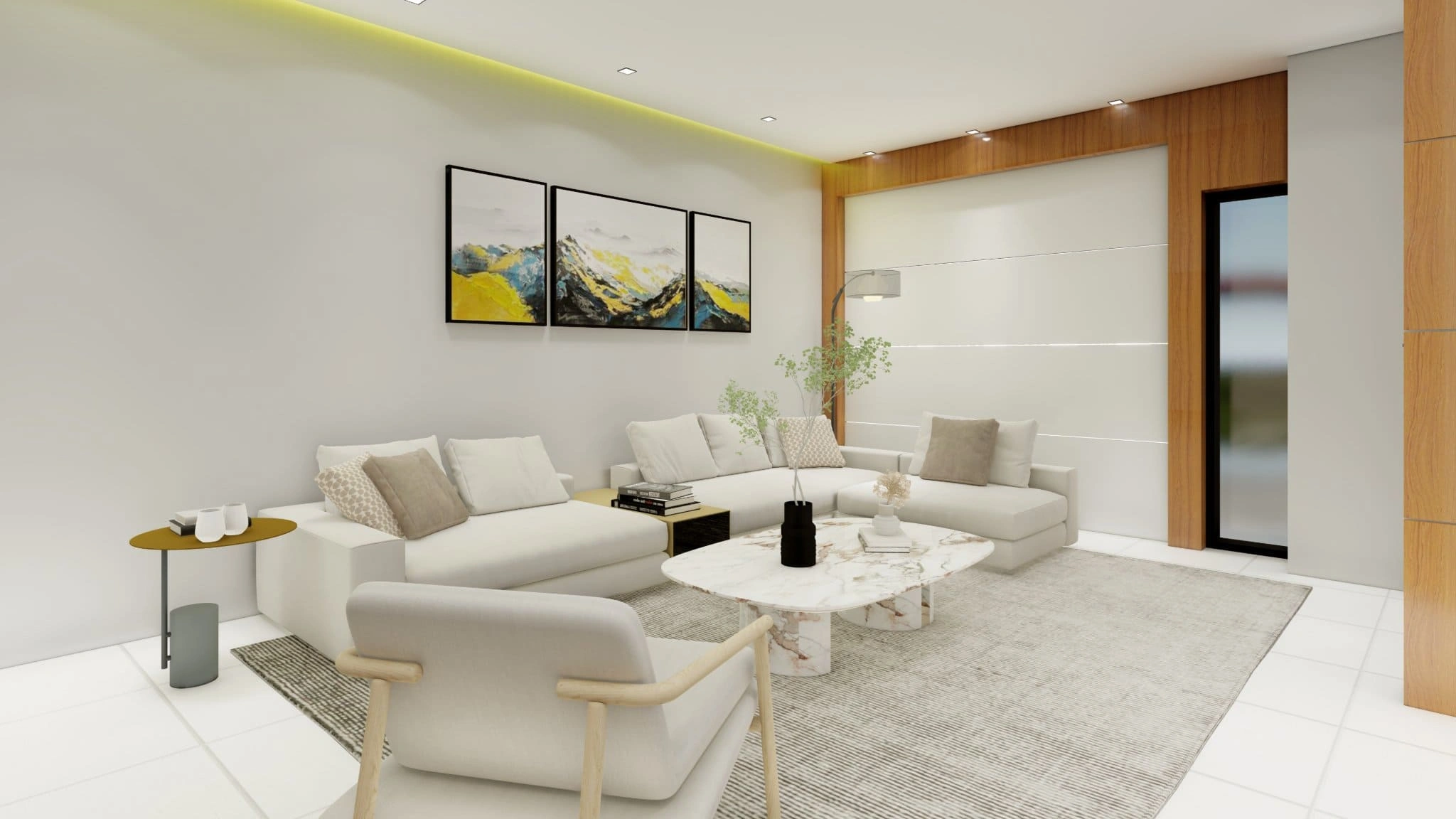 The interior features a neutral color palette dominated by warm whites and soft wood tones. A marble-top coffee table and light-textured rug create a refined centerpiece, while modern artwork adds depth and vibrancy to the otherwise serene atmosphere. Subtle cove lighting enhances the room’s architectural lines and complements the natural tones of the furniture.